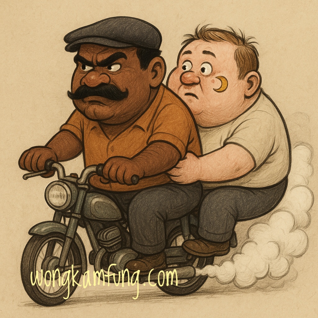 Pagi masih malu-malu membuka tirai kabut tipis ketika suara motor tua menjerit-jerit memekakkan telinga. Motor itu seakan beriba-iba minta ampun karena ditunggangi dua manusia yang tak sadar diri akan bobot tubuhnya. Asapnya berhamburan ke mana-mana. Di atas motor, duduk dua sosok yang sudah lama tidak terlihat di Pasar Anyar. Satu tinggi besar dengan kumis melintang duduk di depan, satunya lagi yang membonceng gemuk putih dengan tato bulan sabit di pipi kiri.